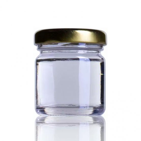 cx. com 90 unidades de vasos B1 onça, com tampa TO43 dourada incluída /capacidade 30ml / altura 39,25mm / diâmetro 43,3mm; ideal para mel ou compotas, para amostras, ofertas, brindes e divulgação de produtos.